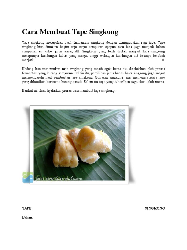Cara Membuat Tape Doc Document from static.fdokumen.com Tapai (tape) adalah makanan yang terbuat dari singkong / ketela pohon yang di fermentasi.tape memiliki tekstur yang lembut dan lunak dengan rasa yang manis. Resep dan beberapa cara membuat tape singkong manis yang mudah. Jika ingin lebih mantap lagi lalu masukan ke dalam baskom yang sudah dilapisi daun singkong. Tehnik membuat tape singkong adalah membaluri singkong yang sudah dimasak setengah masak dengan ragi tape atau saccharomyces cerevisiae. Penasaran kan apa saja sih manfaat dari tape singkong? Singkong kata pengantar kehidupan manusia semakin berkembang dan sejahtera karena adanya bioteknologi, yang semakin berkembang. Kamu bisa membuat tape singkong sendiri di rumah bagi kamu yang tertarik membuat tape singkong, berikut indozone bagikan resep beserta tips bagaimana membuat tape singkong yang nikmat. Makanan tradisional ini berasal dari jawa, tetapi sudah sangat familiar di berbagai daerah.